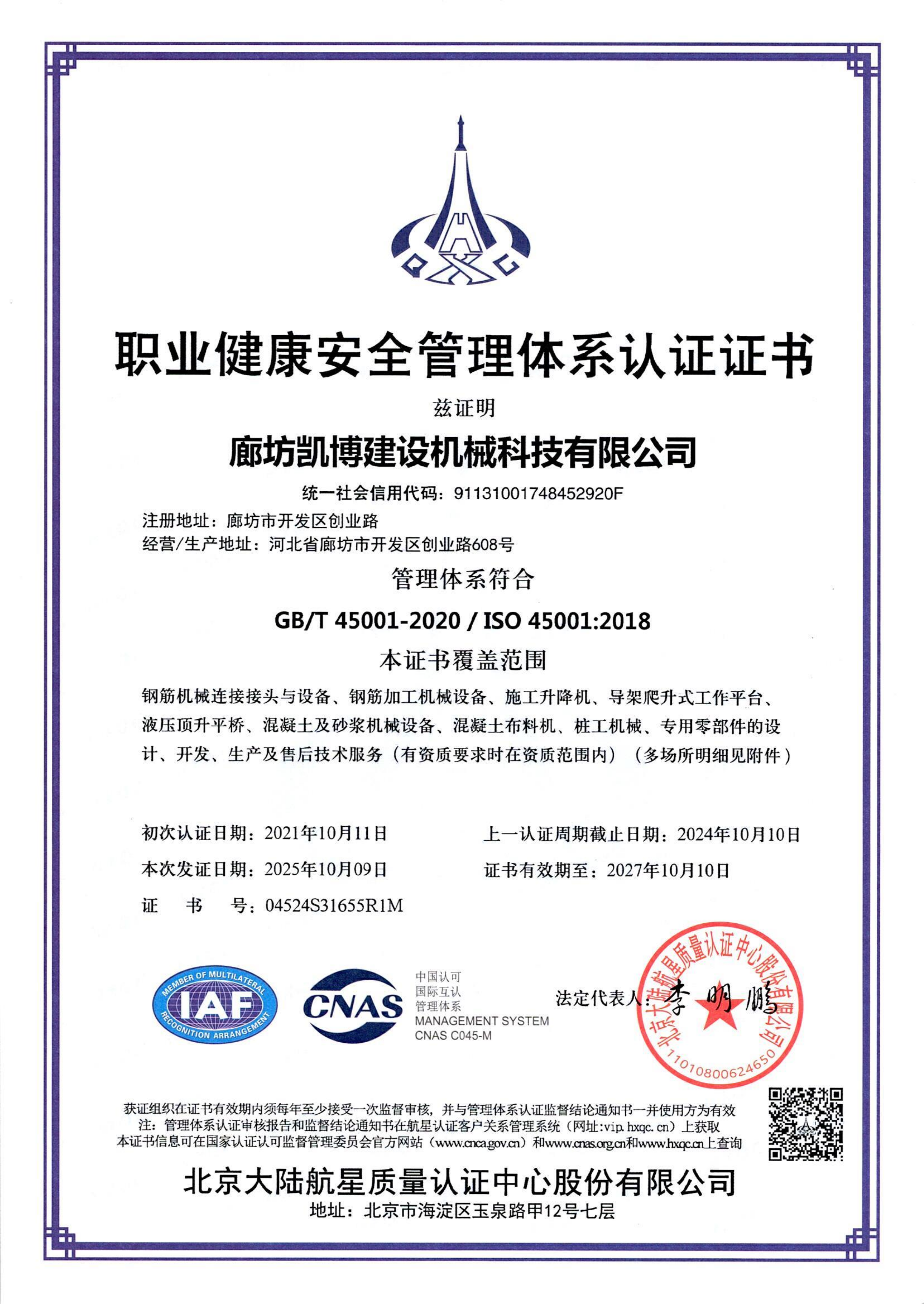 職業健康安全管理體系認證證書