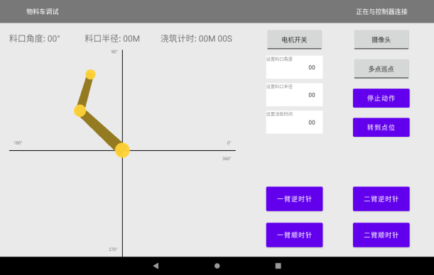 • 借助APP可實時監測各臂架回轉角度、澆筑半徑、巡點進度、電磁閥狀態及系統報警信息,并實時查看出料口視頻影像,全程可視、可控。