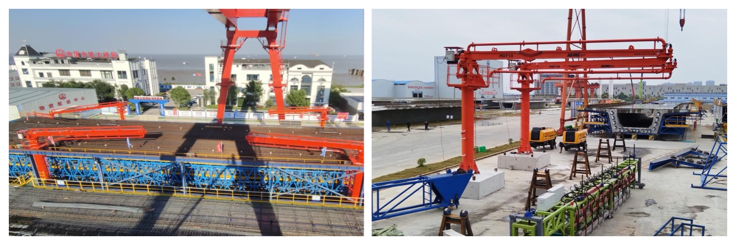 “建研”智能布料機已廣泛應用于橋梁建設的多個關鍵環節,包括錨碇、承臺、預制箱梁、橋面及橋塔等部位的混凝土澆筑。