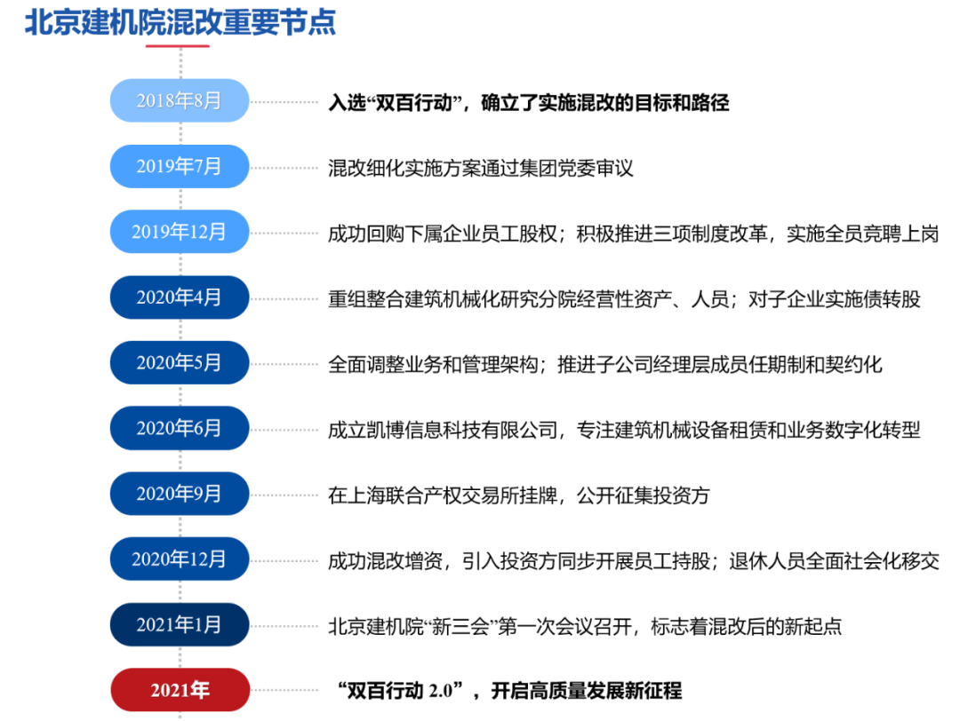 ? ? 2020年12月,北京建機(jī)院通過上海聯(lián)合產(chǎn)權(quán)交易所成功引入中泰云智裝備制造(山東)有限公司、國(guó)新雙百壹號(hào)(杭州)股權(quán)投資合伙企業(yè)(有限合伙)、淮北建元綠金碳谷創(chuàng)業(yè)投資基金合伙企業(yè)(有限合伙)、海安市申菱電器制造有限公司等4家民營(yíng)企業(yè)和金融資本,同步實(shí)施員工持股,募集資金近4億元。